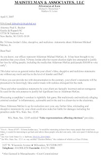 Since Alderman McGee is up for reelection next year, any further false, misleading and deceptive statements by your client could also make her liable for damages including the penalties under Wis. Stats. Sec. 12.05.